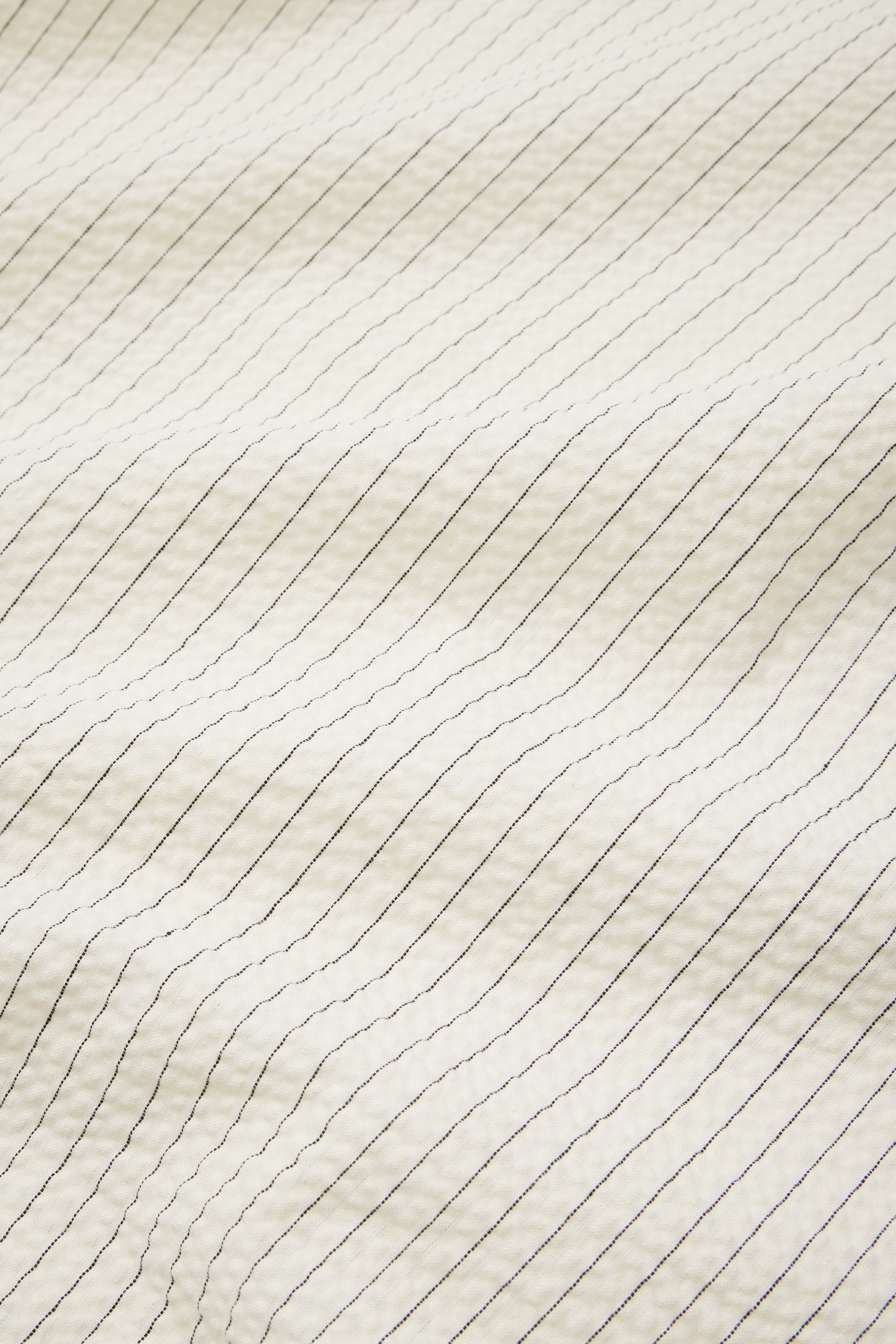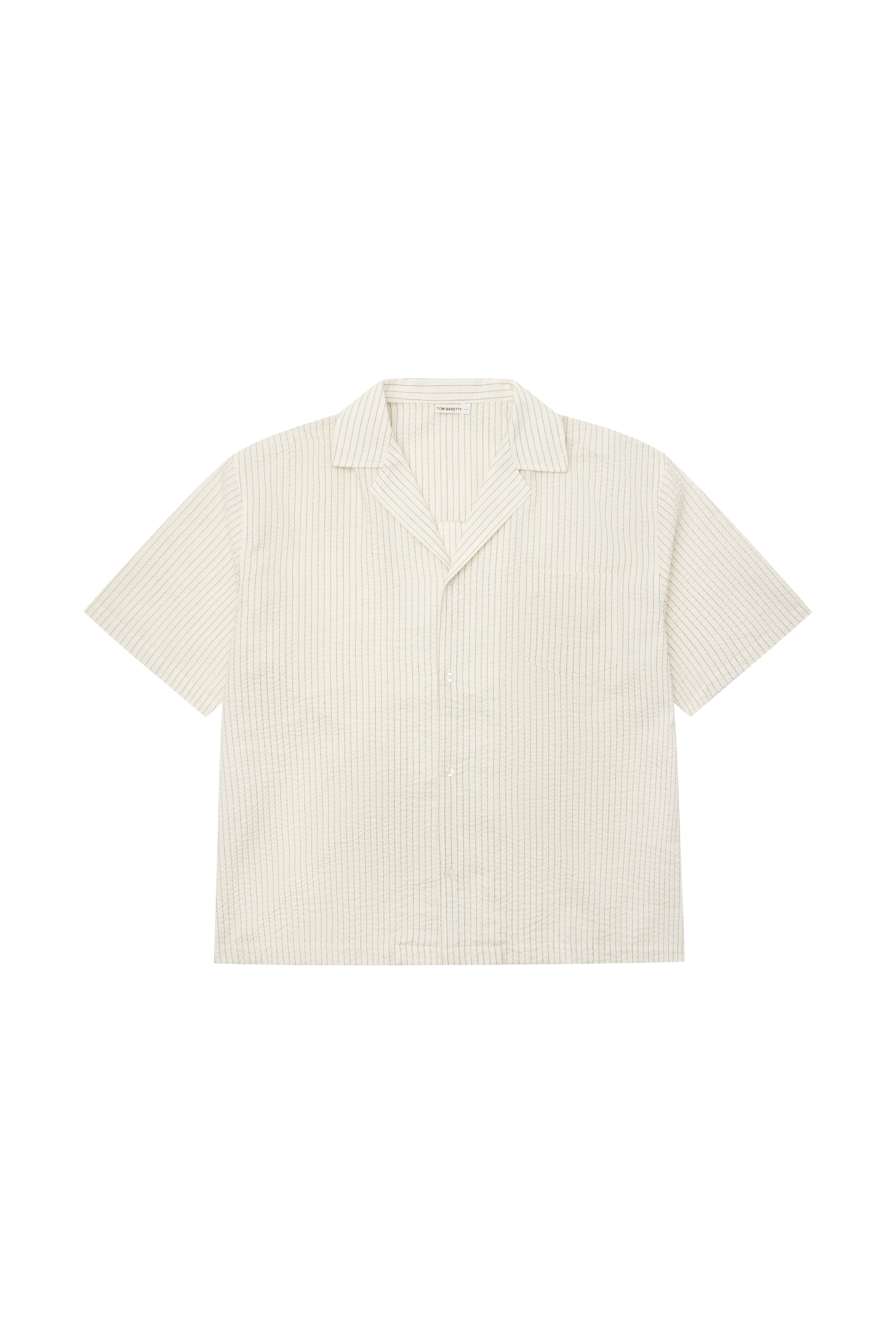 The White Box Shirt is cut from lightweight seersucker cotton, chosen for its breathable structure and subtle texture. Black pinstripes run cleanly through the fabric, adding contrast while maintaining a minimal, considered aesthetic.