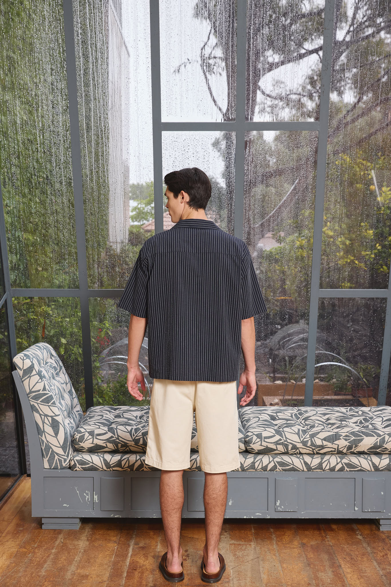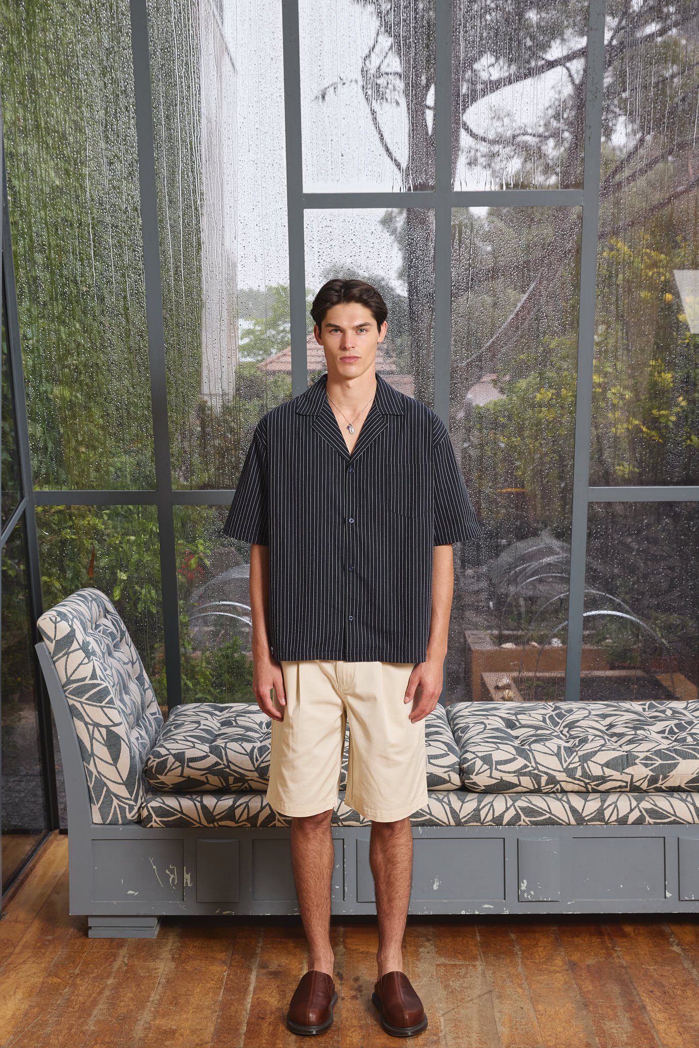 The Navy Box Shirt is cut from lightweight seersucker cotton, chosen for its breathable structure and subtle texture. White pinstripes run cleanly through the fabric, adding contrast while maintaining a minimal, considered aesthetic.